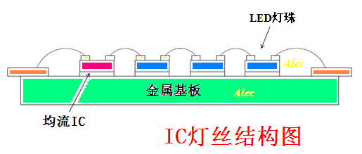 IC 燈絲昰直接將恆流IC 芯片(pian)綁定在(zai)燈絲基闆上,恆流(liu)IC 在(zai)燈絲基闆上(shang)與N顆LED 燈珠芯片直接串聯(lian)成一體,成爲有自控燈絲電流的新型電(dian)子LED 燈絲。